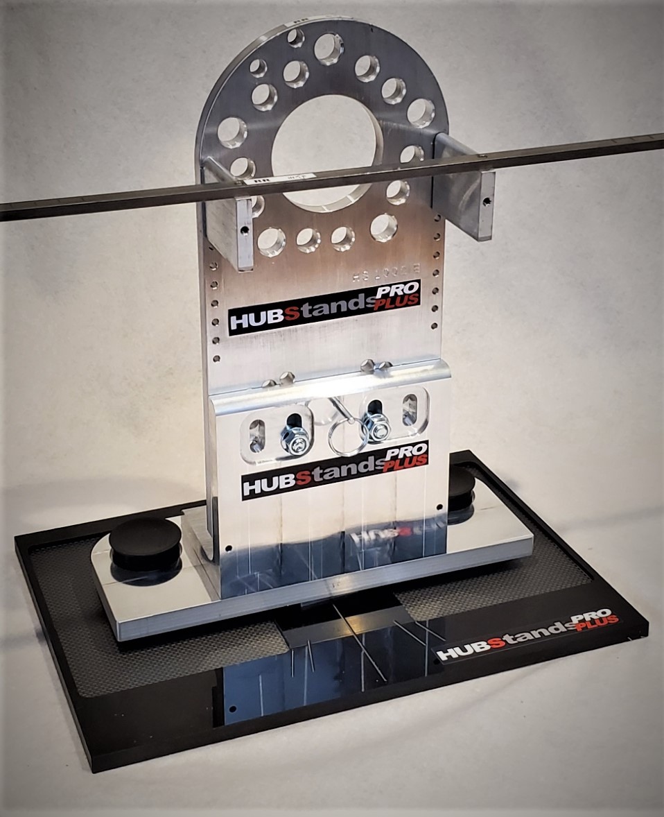HUBStands ProPLUS brand set up stands with omni-directional roller ball bases are adjustable for wheel offsets, scrub radius, exact tire sizes and ride heights. They come as a complete set of 4 with stainless toe sticks, acrylic/composite safety plates and a choice of multi-pattern interchangeable hub plates. (Shown here in use with ProSTIX, Camber Gauges, Scales and Pad Levelers)